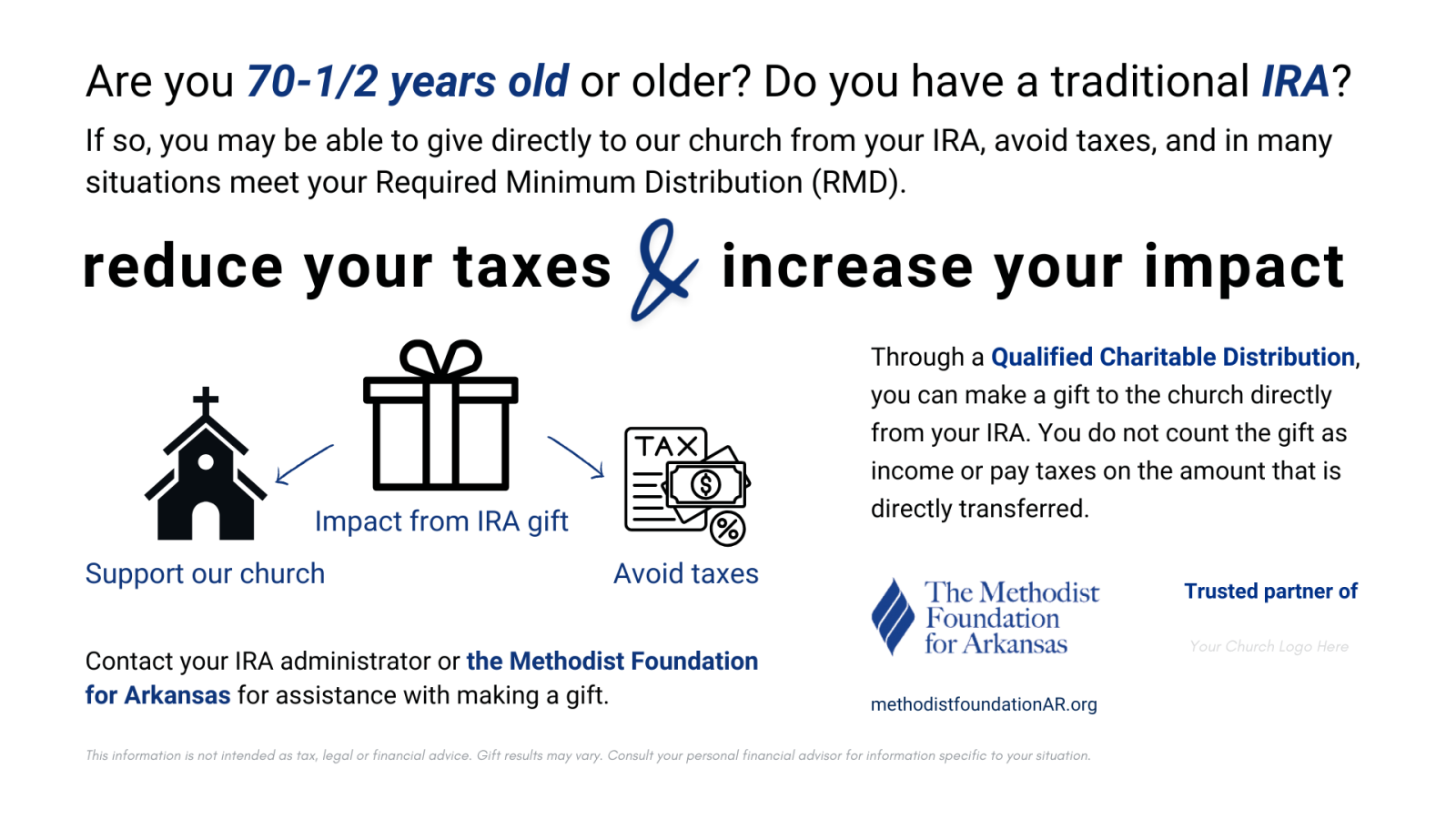 A one-sided insert that explains how a Qualified Charitable Distribution can help you reduce your taxes while increasing your impact.